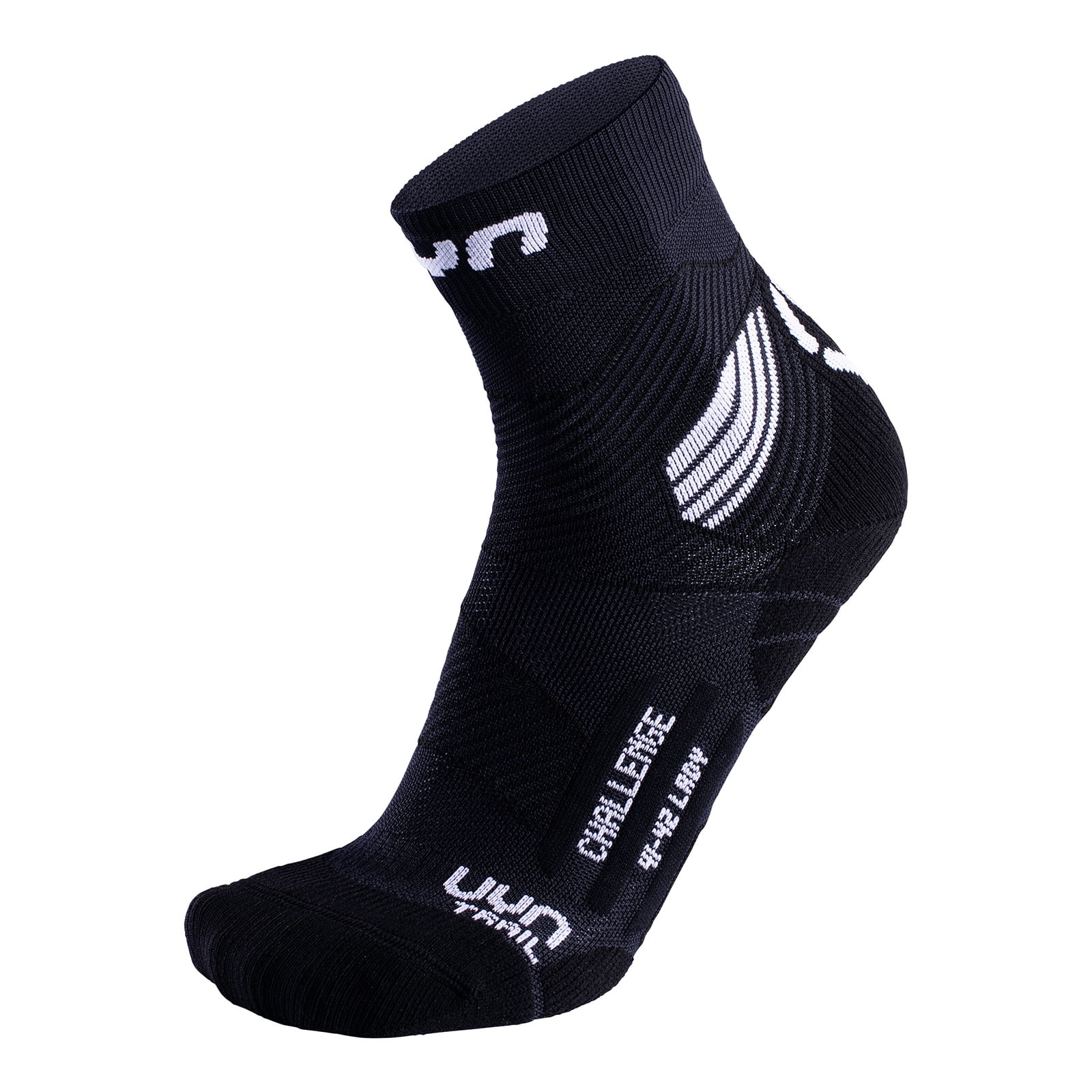 Skarpetki do biegania Trail Challenge firmy UYN®. Ich konstrukcja, obejmująca selektywną kompresję, wspiera i chroni stopę, zwłaszcza wrażliwe ścięgno Achillesa i okolicę kostki. Materiał Natex, wykonany w 100% z roślinnego włókna nylonowego, zapewnia optymalne zarządzanie klimatem.